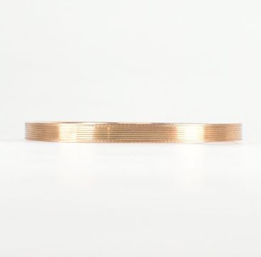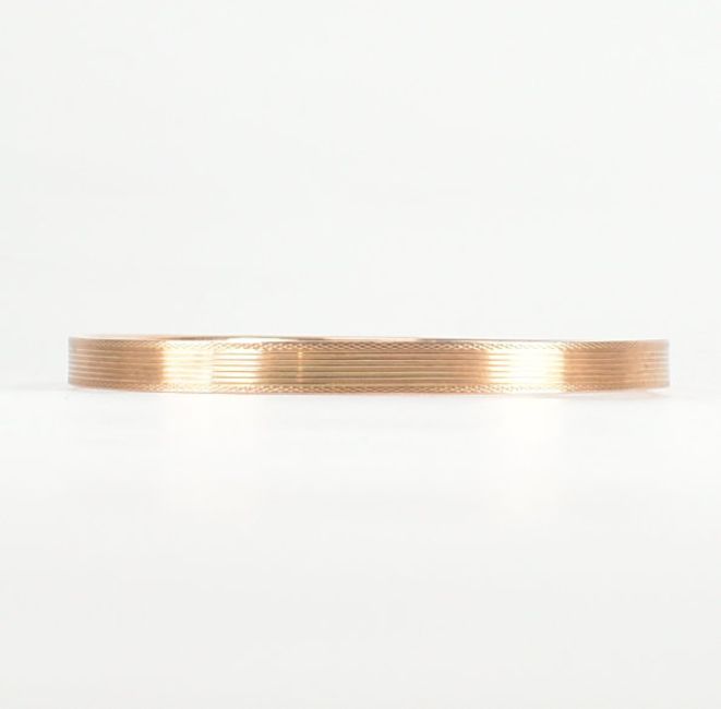 A 9ct rose gold etched design bangle armlet. The bracelet / arm band of circular reverse D form having banded & crosshatched engine turned design throughout. Marked 9ct, S&P. Total weight approx 10.8g. Measures approx 8.5cm. All weights, measurements and sizes are approximate