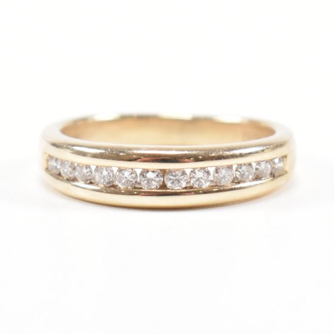 A hallmarked 9ct gold and diamond half eternity ring. The ring set with twelve suspension set round brilliant cut diamonds to tapering shank.  The diamonds total approximately 0.38ct. Weight approximately 3.3g. Size approx K. All weights, measurements and sizes are approximate