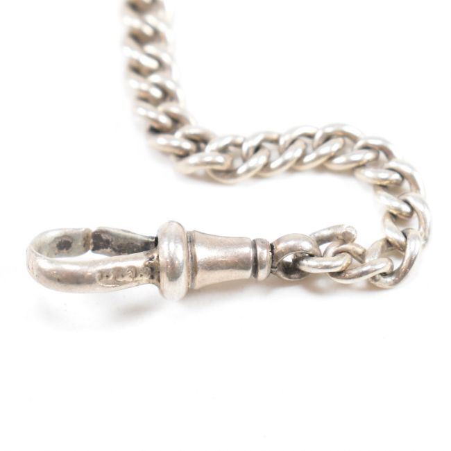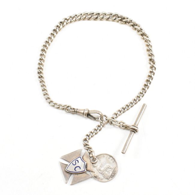 A silver hallmarked albert pocket watch chain with medal, t-bar and c-clasp. Marks illegible to the t-bar. The medal with SC monogram, hallmarked Birmingham and also an 1836 silver four pence. Total weight 21.7g Measures 28cm length. All weights, measurements and sizes are approximate