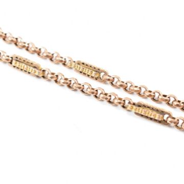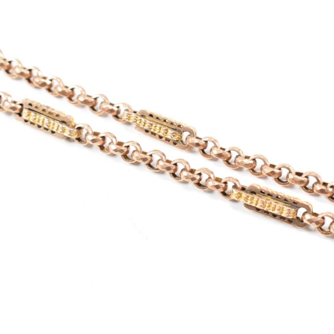 A 19th century Victorian 9ct gold book - albert watch chain. Round links with rococo offset bar spacers united by t-bar and c-clasp. Total weight 19.2g. Chain measures 36cm approx. Sponsors mark CDB, stamped 9C. All weights, measurements and sizes are approximate