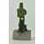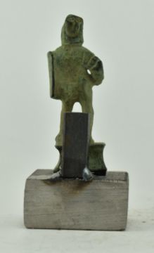 A believed Roman era bronze figurine of a gladiator. The gladiator with helmet, shield and dagger, standing on a plinth. The figure mounted atop a recent chrome stand. Measures approx. 8cm tall.