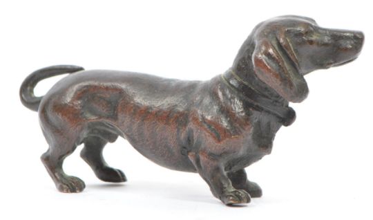 Vintage 20th century bronze miniature sculpture / statue of a dog Dachshund. With the initials TWT mark to under of paw. Measures approx. 4cm tall.