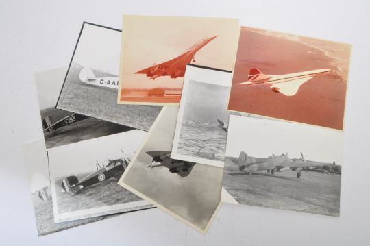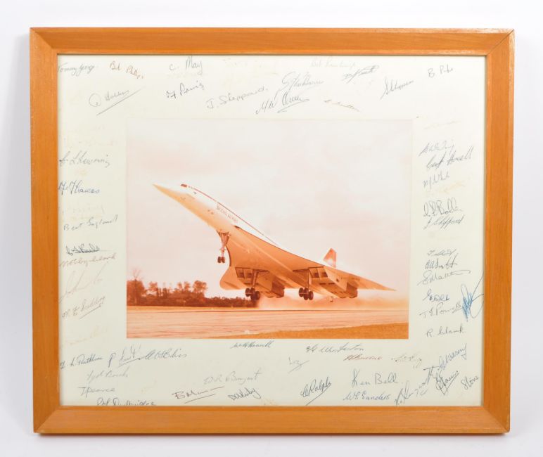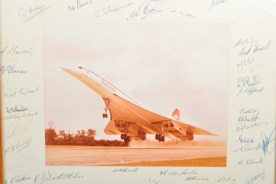 A vintage 20th century framed and glazed promotional photograph of British Airways Concorde airplane. Signed by members of the Filton, Bristol staff. Along with other photographs, further Concorde pictures and other aircraft. One stamped to back reading, British Aerospace aircraft group, Weybridge Bristol division photographic department, Filton C1843. Measures 35cm x 41cm