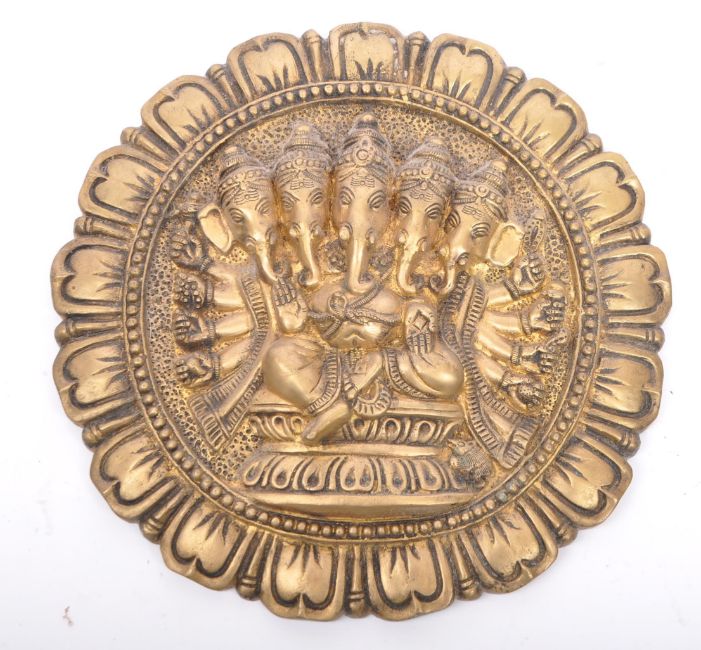 A heavy early 20th century Indian Hindu religious gilt cast metal wall plaque to depict Ganesh with beaded and gadrooned border. Measures 30cm diameter.