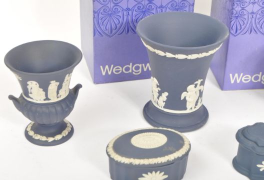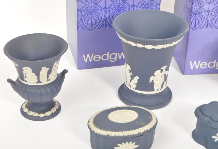 Wedgwood - A collection of 20th century Wedgwood jasperware cameo ware ceramics in blue to include two boxed vases, pots and urns. All with blue ground and bas-relief classical scenes to surface. Measures 10cm tall.