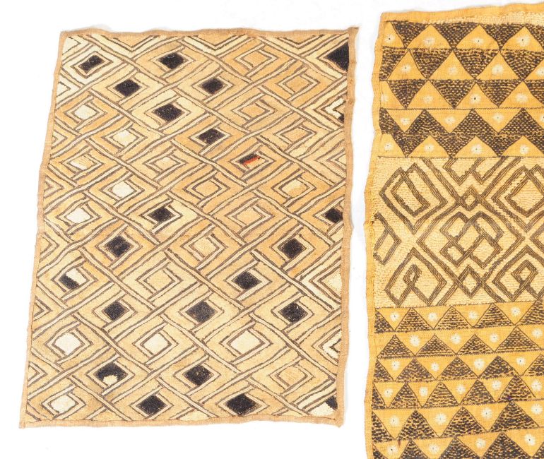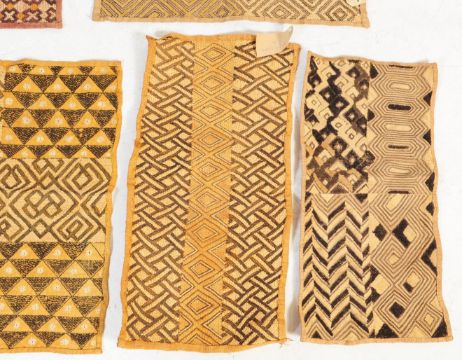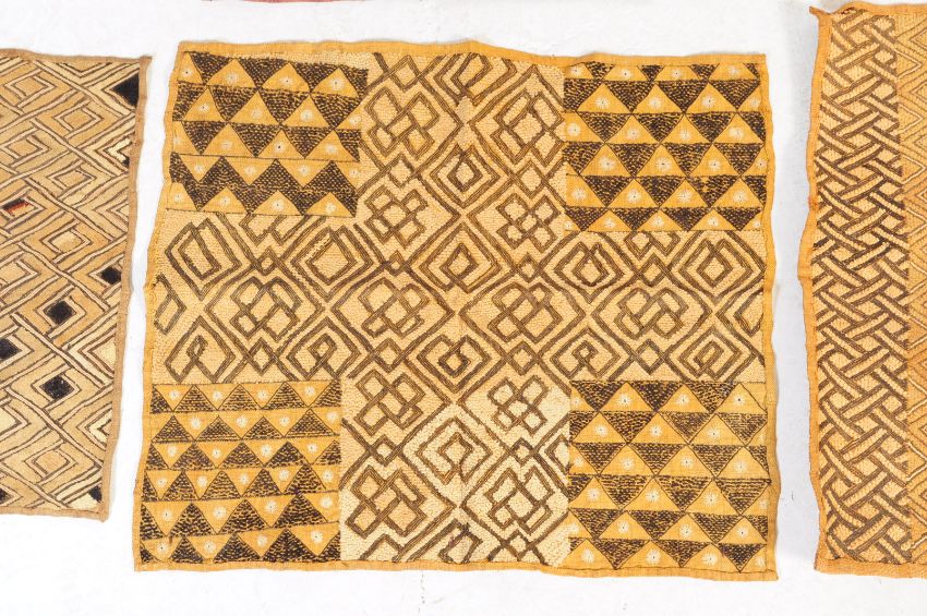 Six early to mid century Kuba / African tribal tapestry cloth ethnic wall hangings / table decoration. Hand woven panel of rectangular (five in number) and square form (one in number), the tapestries made up of various abstract paternation fabric patch-worked together & hand dyed in black, red, brown earth colourways. The Kuba Kingdom, also known as the Kingdom of the Bakuba or Bushongo, is a traditional kingdom in Central Africa. The Kuba Kingdom flourished between the 17th and 19th centuries in the region bordered by the Sankuru, Lulua, and Kasai rivers in the heart of the modern-day Democratic Republic of the Congo. Rectangular measures approx. 31cm x 63cm / Square measures approx. 58cm x 68cm .