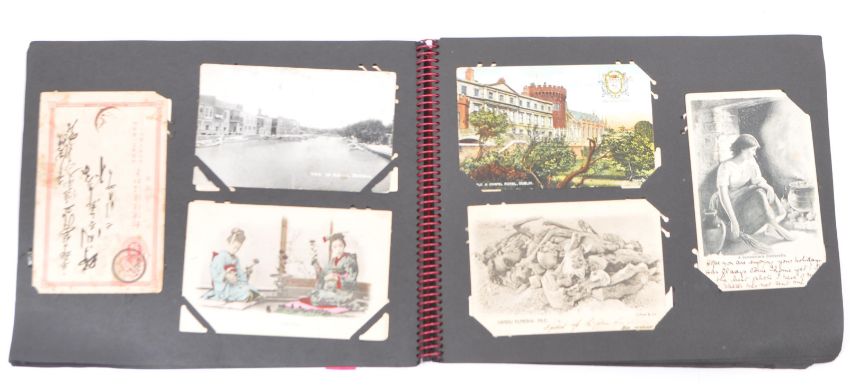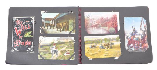 A collection of First World War WWII, Edwardian and later United Kingdom & foreign postcards. Comprising of Tanks, English seaside towns, Berkswell, Simmonds St, Johannesburg, Reichenbach, religious sayings, Dutch figures, Rimbert - Vue Generaie, A street in Flanders, Armentieres, Japanese kabuki theatre figures, drawn pictured postcards and other examples. Collected and displayed in an album.