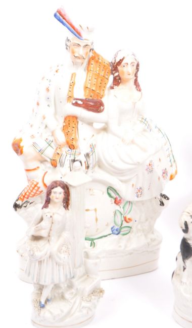 A collection of 5 19th century Victorian Staffordshire flatback figurines to include William III, maiden with dog, Horse and rider, Dandy gent and maiden over clock face etc