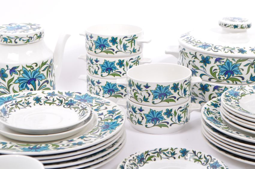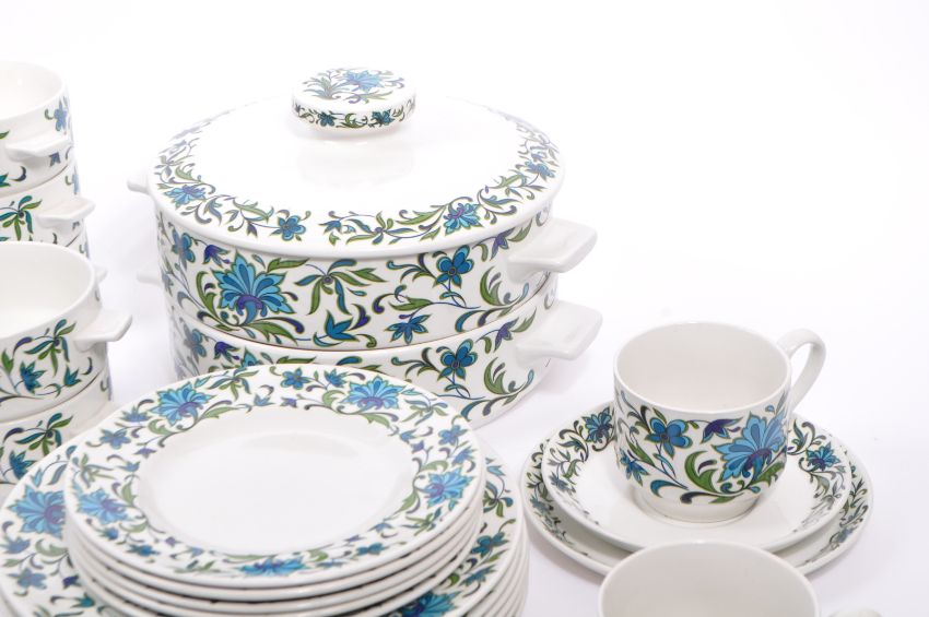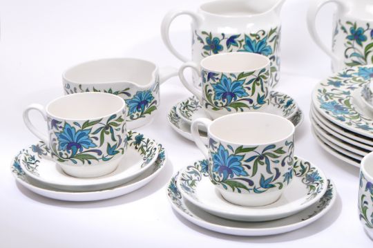 Midwinter - Spanish Garden - A retro mid 20th century circa 1960s Midwinter tea and dinner service in the Spanish Garden pattern. Each piece having a white ground with blue and green stylised floral pattern to surface. To include teapot, teacups, saucers, side plates, dinner plates, jug, soup bowls, tureens.