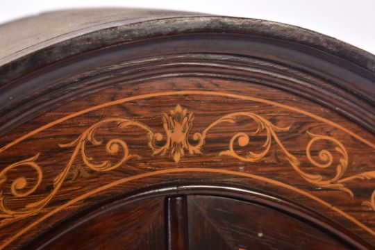 A 20th century Edwardian inlaid rosewood hanging display cabinet. The cabinet having an arched top with inlaid and stencilled decoration. Two full length doors each with beveled edge glass panels. The interior with mirrored back and glass shelf set within. Measures approx. 85cm x 68cm x 25cm.