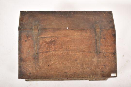 An 17th century carved oak bible box. The box having a sloping hinged lidded top with iron hinges and lock. Carved scrolled detailing to the front. Measures approx. 34cm x 77cm x 48cm.