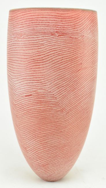 Pippin Drysdale (Australian, b. 1943) - Tanami Traces series IV - c. 2007 -  An original ceramic ovoid vase in striped pink & white. Signed to base. Measures approx. 33cm tall,  16cm in diameter