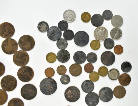 A collection of 19th century and later foreign & GB currency coins. The lot to include c50 Victorian bun pennies, late 20th century American quarters, Gibraltar 2003 dolphin 50p, as well as currency from the Isle of Man, East Africa, Spain, Canada, Ireland etc, and a French bronze commemorative medal for the Organisation for Economic Co-Operation and Development 1960-1980.