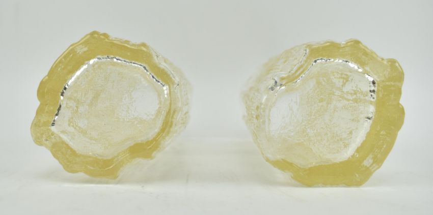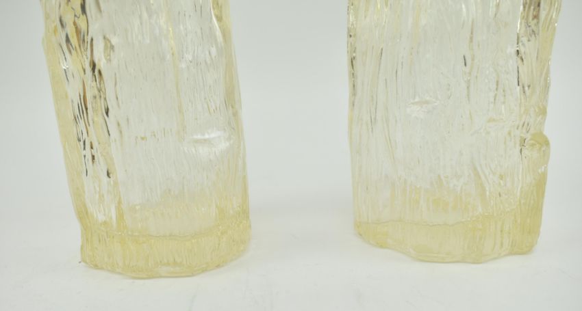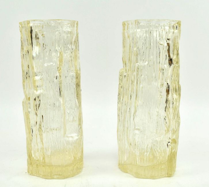 Pilkington - a pair of vintage mid 20th century circa 1970s glass tree bark vases. Each of transparent glass with textured bark surface effect. Each vase to measure approx. 21cm tall.