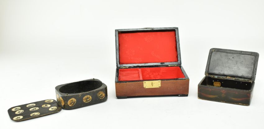 A collection of three 19th century and later wooden trinket boxes. The lot comprising a lacquer box commemorating the Battle of Montereau, featuring a hand painted depiction of Napoleon firing a canon and dated 1814, a black lacquer trinket box with animal stamp decoration, and a 20th century Chinese box with a cork diorama scene featuring birds & trees with Mount Fuji in the background. Largest to measure approx. 7cm x 17cm x 11cm.