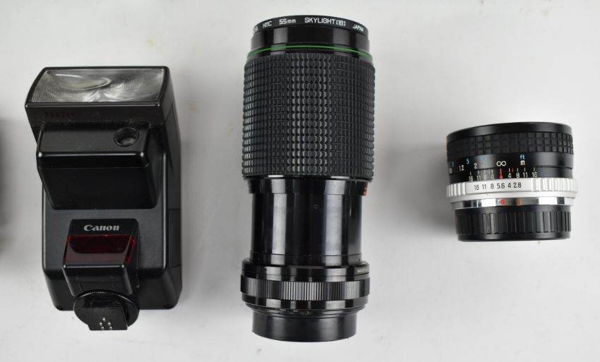 A collection of vintage camera lenses. The lot comprising a Voigtlander Super Dynarex in original leather case, a Hoya Helios MC 135mm, a Vivitar VMC series 1 70-210mm, a Tamron 70-300mm, a Tokina RMC 70-150mm, an Osawa MC 1:5 85-300mm No. 1321233, a Tamron SP, a Hoya HMC wide auto 1:28 361794, and a Canon Speedlite 300EZ flash. Ten items in lot.