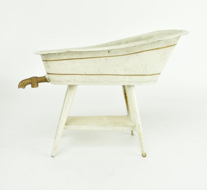 A collection of three pieces of vintage mid 20th century doll's house tinplate kitchen furniture. The enamel painted furnishings comprising a stove with saucepan, a mirrored dressing table, and a bathtub. Marked Made in England. Stove to measure approx. 20cm tall, 17cm wide.