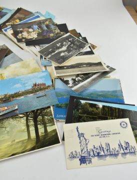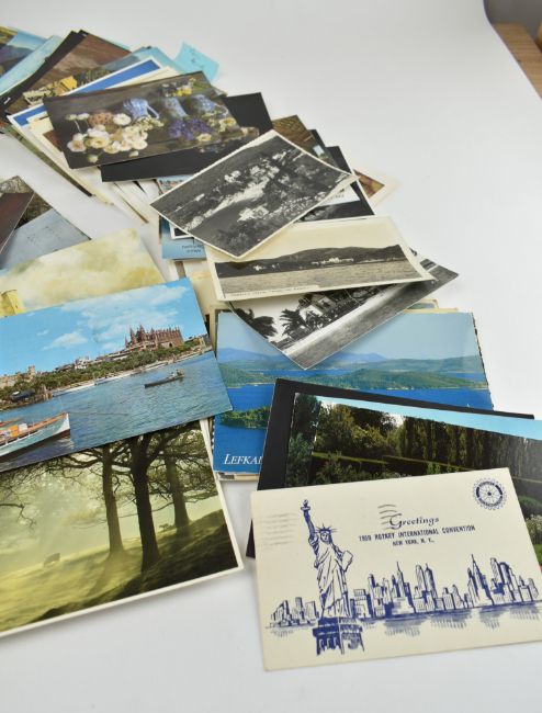 A collection of late 19th century & later postcards and greeting cards. The lot to include Love Life by John Churchill, a limited edition of 15 postcard designs of 500, this being No. 415 signed by the artist, fifteen Victorian and Edwardian Christmas cards, and tourist & museum postcards from Strasbourg, Teignmouth, Burgh Island, envelopes from the Waldorf Astoria, Sark, Verona, Mallorca, Peru, Barcelona etc. Many depicting renowned artworks purchased from museums. Majority mid-late 20th century. Over two hundred in lot.