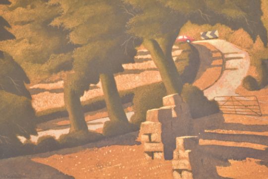 Simon Palmer (British, b. 1956) She Drives a Red Rusty Renault watercolour, gouache and pen and ink on paper Signed & titled in pencil Framed & glazed 32 x 30cm  Provenance: With acquisition receipt by Alexander Gallery, Clifton, Bristol, where bought by present owner, in 1986. Simon Palmer was born in Yorkshire in 1956 and was brought up in Bromley where his family moved when he was eight months old. He graduated from Reigate Art School in 1977. In the Easter of 1976 he travelled from the south of England with friends to spend a few days in Lastingham, North Yorkshire. It was then that he fell in love with the landscape that has been his inspiration ever since. For the past 40 years he has lived and worked in Wensleydale, North Yorkshire. This lot is also sold subject to Artists Resale Rights, details of which can be found in our Terms and Conditions.