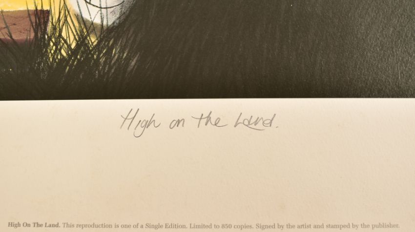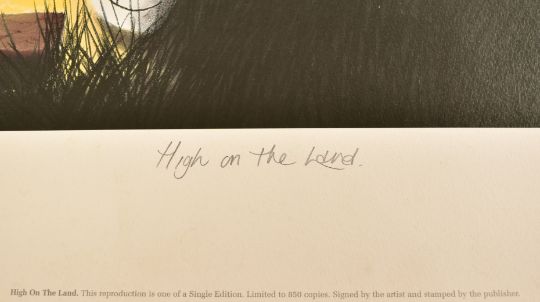 Mackenzie Thorpe (British, b 1956) High on the Land, 1999 Lithography on paper Signed, titled and numbered 361/850 - Published by Washing Green with Certificate of Authenticity Unframed  35 x 50cm (13.5" x 20") Mackenzie Thorpe (British, b.1956) was born in Middlesbrough, North Yorkshire, as the first of seven children. Thorpe's father worked as a laborer and his mother worked as a nurse. During Thorpe's early years, he used whatever items he could find to express himself artistically. He often used materials such as crayons, cigarette boxes, and pencil stubs to create artwork; he even resorted to taking his mother's eye shadow and lipstick out of her make-up bag. Following in the footsteps of other family members, Thorpe started out working as a laborer in the town shipyards. After encouragement from a friend, he decided to feed his passion for painting and drawing and began to pursue a career as an artist. In 1977, Thorpe enrolled in the Cleveland College of Art and Design, where he studied under the mentorship of Tom Wall (British, 1941–1992). He then went on to study at the Byam Shaw College of Art in London, where he earned a Fine Arts degree. Thorpe continued to live in London after he graduated in 1982, in order to work with disadvantaged children in the city. Later he moved back to North Yorkshire with his wife and children in order to provide a better life for them. Upon returning, he set up a studio and a gallery in Richmond. Much of Thorpe's artwork portrays a wide range of emotions through portrait-style depictions of animals and humans. In 2000, he won the Best Selling Published Artist award from the Fine Art Trade Guild. In that same year, he also received an honorary Master of Arts degree from Teesside University in his hometown. In 2005, he created the Mackenzie Thorpe Foundation, which supports a number of worthy causes. In the fall of 2006, he put together an outdoor exhibition in Kansas City, MO, that featured large sculptures. Thorpe plans to produce similar exhibitions in Australia, the United Kingdom, and New Zealand. This lot is sold subject to Artists Resale Rights, details of which can be found in our Terms and Conditions.