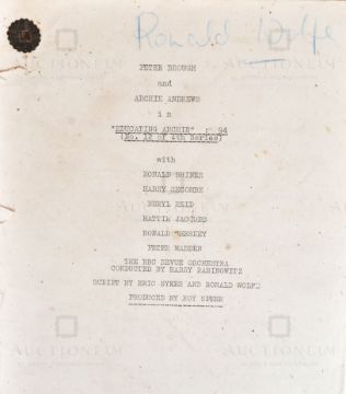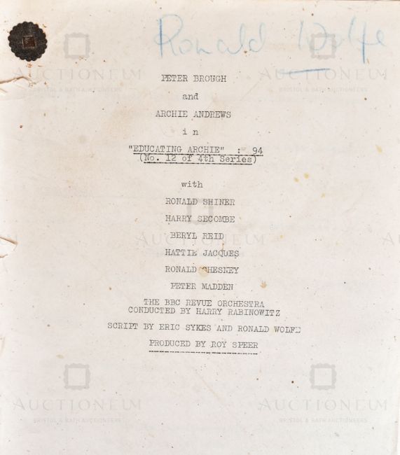 Peter Brough and Archie Andrews In 'Educating Archie' (BBC Radio Programme 1950-1960) - an original production script once belonging to writer Ronald Wolfe. and featuring Ronald Shiner, Harry Secombe, Beryl Reid, Hattie Jacques, Ronald Chesney and Peter Madden, with script by Eric Sykes and Ronald Wolfe. Dated 20th December 1953, for Episode 94 - No. 12 of the 4th Series. 27pp, plus cover.  Contains many alterations in pencil throughout, with crossed out lines and added notes etc. Early piece of British Comedy memorabilia.