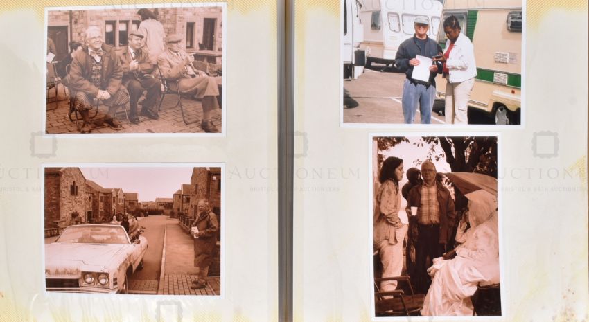 From The Estate Of Tom Owen (1949-2022) - Last Of The Summer Wine - Tom Owen's 'Last Of The Summer Wine' scrapbook from 2002/03/04/05. Large green album filled with photographs taken during filming (some candid, others official photographs), many behind-the-scenes images, several large cast photographs present, and other items. A couple of pages feature photographs from his pantomime projects, but the album is largely LOTSW related. The final image in the album is an on-set image of the 'See Ya Compo' hillside sign that featured in Compo's funeral episode. A unique album.