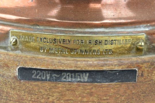 A fantastic 1970s copper with brass hot water kettle/urn/dispenser with beautiful brass cast vine leaves design handles mounted on a wooden plinth. Complete with cable, sold as untested. Measuring approx. 45cm x 25cm.