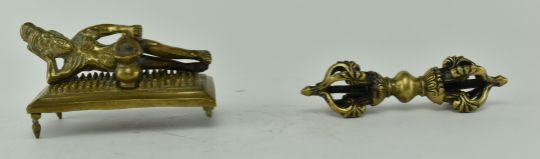 A Tibetan brass Vajra / Dorje Dharma ornament and a brass Indian man / Fakir / Sadhu on a bed of nails with his hair tied above his head, with a pot in front of him. There is one foot missing from the bed. Vajra measures approx. 10.5cm long and Fakir approx. 10x 5cm.