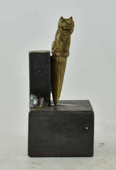 A 19th century Victorian gilt cast metal tiger fang tooth pick. The the toothpick depicting a miniature tiger in seating position over a fang. Raised on later plinth. The amulet measuring approx. 5cm tall.