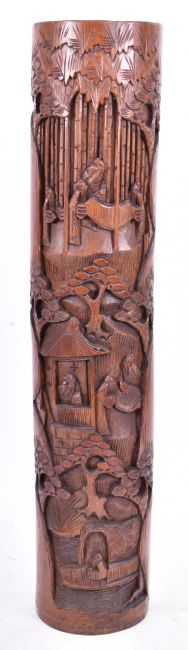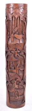 A tall early 20th century Chinese Oriental Qing Dynasty carved bamboo paintbrush pot / bitong / scroll holder. The pot having hand carved decoration depicting village scenes. Measures approx. 56cm tall x 11cm in diameter.