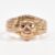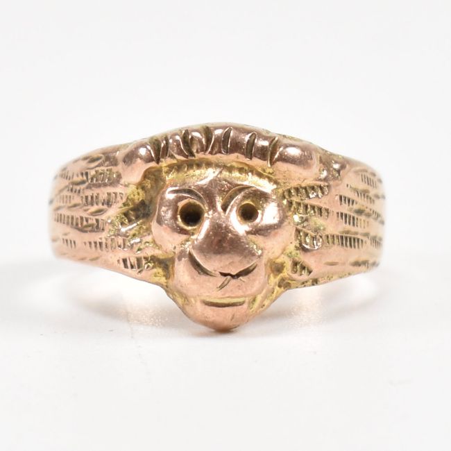 A 9ct gold lion head ring. The ring with central lions head design to plain band. Unmarked, tests indicate 9ct gold. Weight 9.3g. Size U.5. All weights measurements and sizes are approximate.