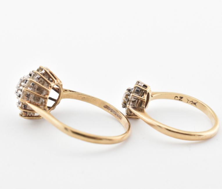 Two hallmarked 9ct gold rings. To include a hallmarked 9ct gold CZ and sapphire cluster ring. Weight 2.9g. Size P. Together with a CZ set cluster ring. Weight 2.1g. Size K. All weights, measurements and sizes are approximate.