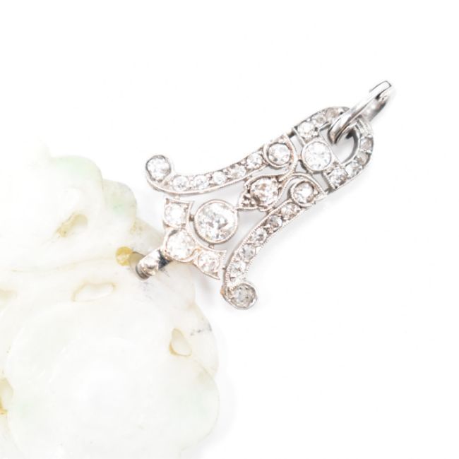A 1920's Art Deco carved jade and diamond pendant necklace. The pendant being carved with florals and fruits with pierced detailing, having a decorative diamond set bale. Pendant measures approx 7.3cm. Principal diamond measures approx 3.3x2.5mm. Weight approx 18.3g. All weights, measurements and sizes are approximate.