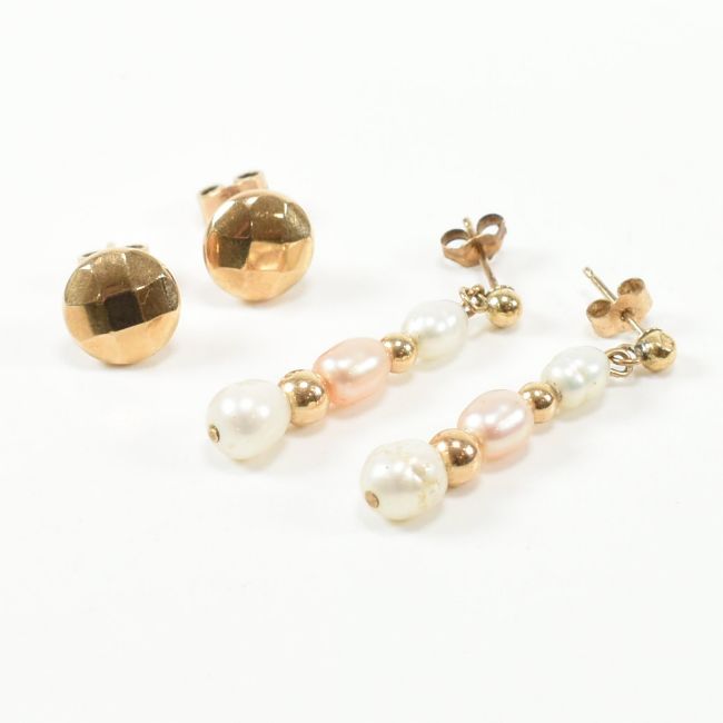 Two pairs of vintage 9ct yellow gold stud earrings. The first button studs having a circular faceted head to straight post backs and butterfly clasps, hallmarked for Birmingham 1986. The second pair of drop studs having granulated gold beads spaced between graduating baroque pearls, marked 375. Total weight approx 3.0g. Largest measures approx 3cm. All weights, measurements and sizes are approximate.