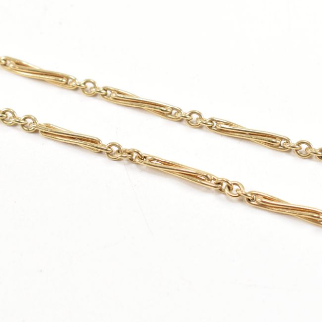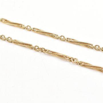 A 9ct gold trombone and lovers knot necklace chain. The chain with trombone and lovers knot links having c-clasp. Stamped 375 with common control mark to bale. Measures 42cm. Weight 19.70g. All weights, measurements and sizes are approximate.