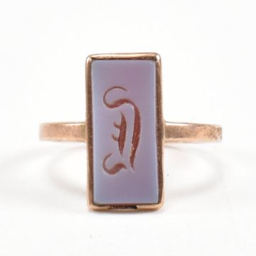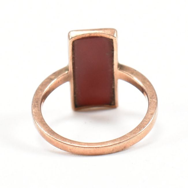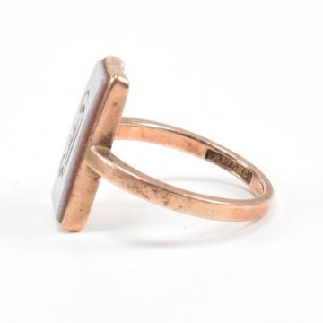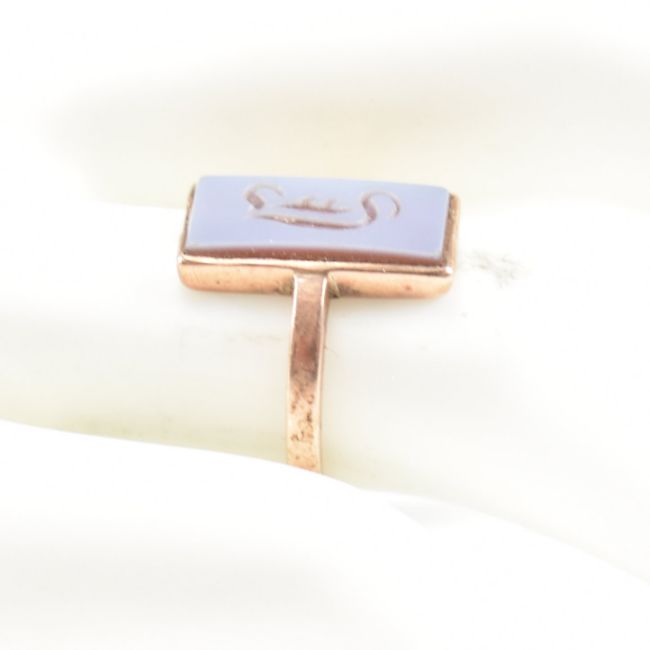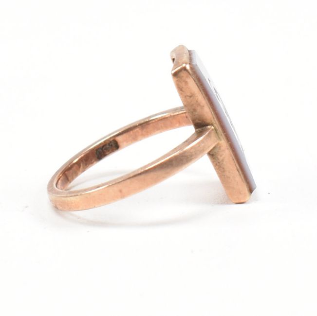 A 1930s carved carnelian intaglio seal ring. Stamped Treicher 9ct. Weight 2.9g. Size M. All weights, measurements and sizes are approximate.