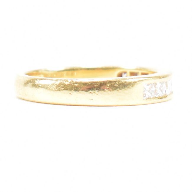 A hallmarked 18ct gold and diamond half eternity ring. The ring set with 9 princess cut diamonds. Estimated diamond weight 0.50ct. Weight 3.5g. Size J. All weights, measurements and sizes are approximate.
