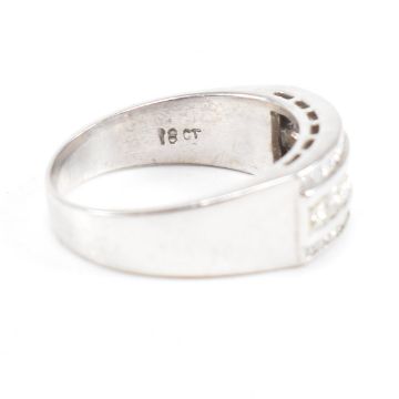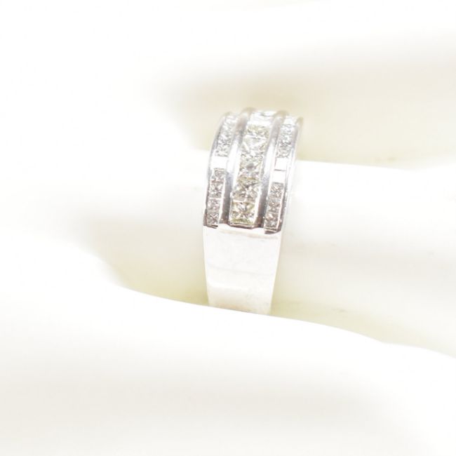 An 18ct white gold and diamond ring. The ring set with three graduated rows of princess cut diamonds stamped 18ct. Estimated diamond weight 1ct. Weight 5.4g. Size O. All weights, measurements and sizes are approximate