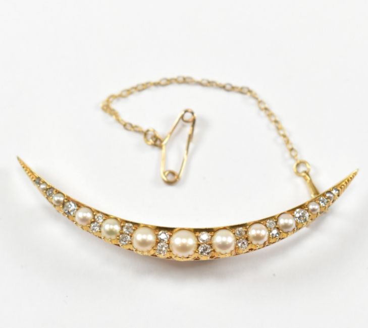 A large 19th century Victorian pearl and diamond crescent brooch pin. The brooch set with split pearls and pairs of old cut diamonds to a crescent mount. The brooch having inscription to gallery for ' A Stellars, Fairfield, Manchester'. Marked 15ct. Measures 6cm. Brooch weight 6.2g.Safety chain 0.4g. All weights measurements and sizes are approximate.