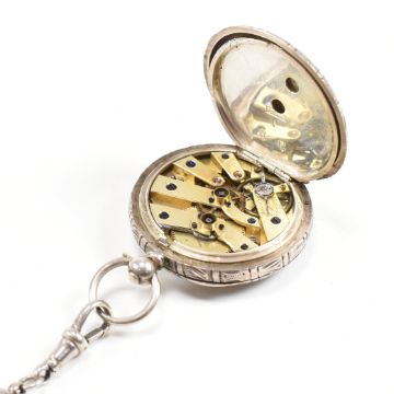 A French silver 935 fob pocket watch. Key wind with gilded decorated enamel dial, Roman numeral chapter ring. The vase with sunburst decoration to the back over plain cartouche. Bale atop. Set to a two string silver fob chain with c-clasp, t-bar and tassel end. Total gross weight 51g approx. Chain measures 27cm. All weights, measurements and sizes are approximate. All pocket watches and wristwatches sold as untested unless specified. Please request condition reports