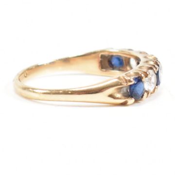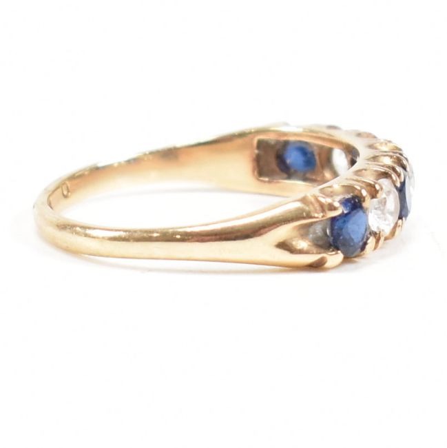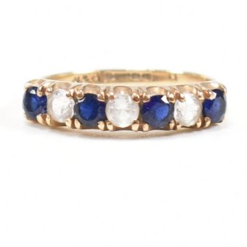 A hallmarked 9ct gold synthetic sapphire and spinel seven stone ring. Weight 2.2g. Size N. All weights, measurements and sizes are approximate.