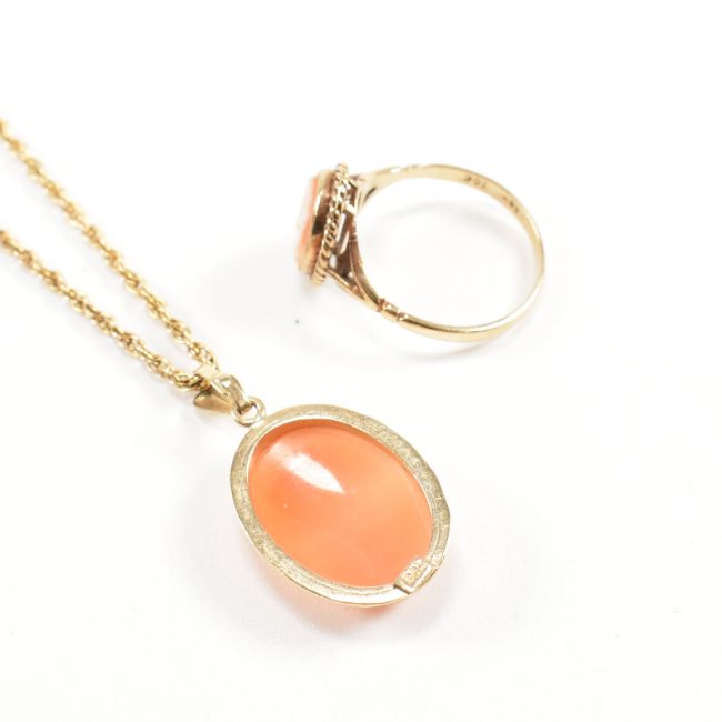 A 9ct gold an shell cameo pendant necklace and ring. The cameos of carved shell. Necklace chain pendant and ring marked 9ct. Weight 7.6g. Ring size M.5. Pendant 2.8cm. All weights measurements and sizes are approximate.