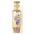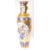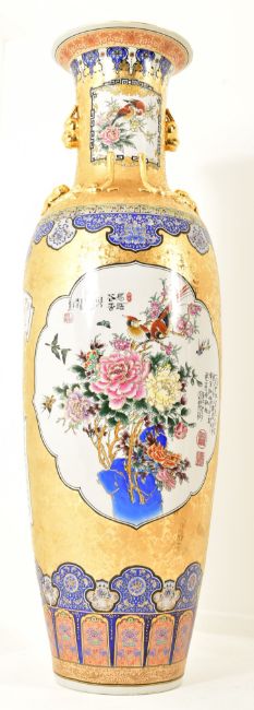 A large 21st century Chinese style gilt & enamelled metal floor vase. The vase having a flared rim over a tall neck and baluster shaped body. With an intricately patterned gilded background featuring shaped vignettes representing flora & fauna. Further scrolls shaped cartouche with text throughout the vase. Blue lotus bands throughout the body. Measures approx. 157cm tall x 45cm in diameter.