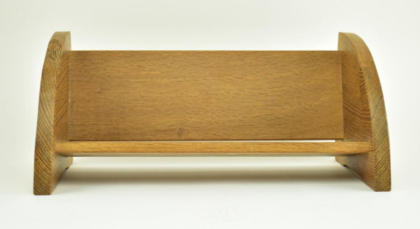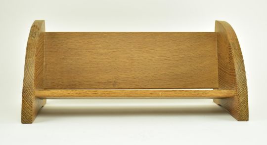 Workshop of Robert 'Mouseman' Thompson of Kilburn - A 20th century oak book trough of typical form with carved mouse running up the side. Measures approx. 21cm x 45cm x 20cm.