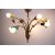 A retro mid century 1950s French designer eight branch hanging ceiling light / chandelier. The light having a central brass column supporting eight arms each with coloured flower head ends. Each arm interspersed with further brass stems having glass and coloured brass flower head decoration. Measures approx. 44cm x 54cm diameter.