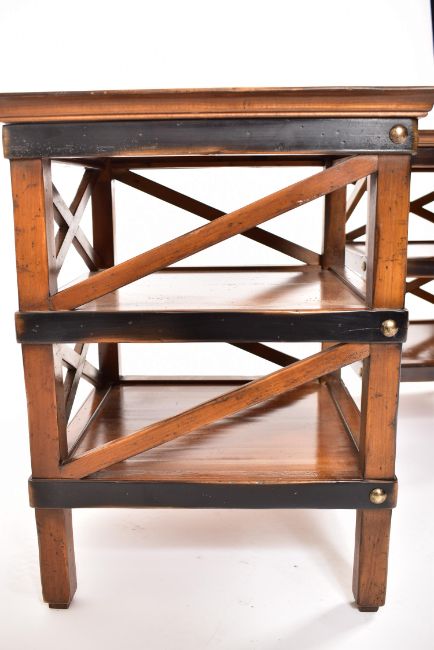 Roche Bobois - Paris - A pair of Architecte II end tables. The side low tables having a a squared flared top over two lower tier shelves with lipped edges. Each tier banded with ebonised metal strips and chrome studs to each corner. Each tier united by diagonal stretchers. Each measuring approx. 50cm x 40cm x 40cm.