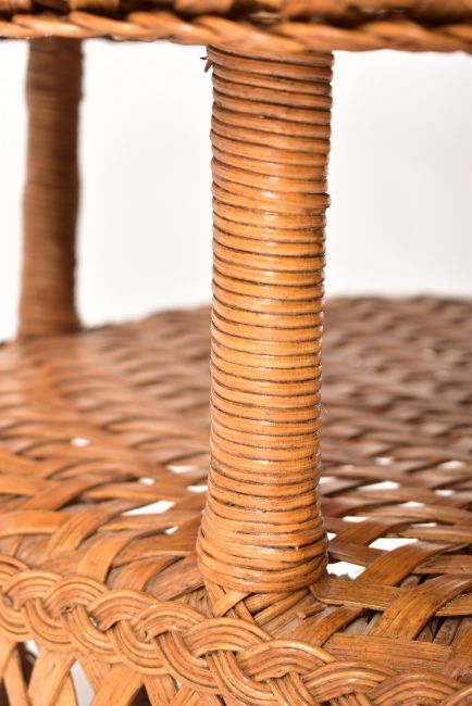 A large 20th century bamboo and wicker woven coffee table / low table. The table having a circular top supported by four spindles and second tier below. All raised on wicker woven splayed leg base. Measures approx. 50cm x 77cm diameter.