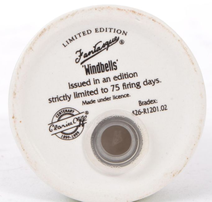 Clarice Cliff - A pair of hand painted sugar sifters by Clarice Cliff. Includes 'House & Bridge', the other 'Windbells' pattern. Each marked to the underside / strictly limited to 75 firing days. Measures 10cm (height).