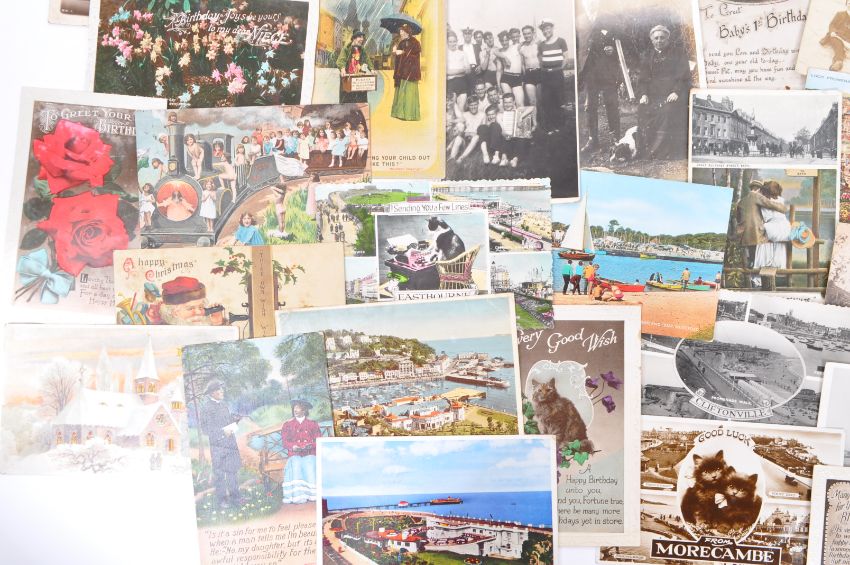 A collection of early to mid 20th century greetings postcards. Comprising of humorous examples, foreign and United Kingdom, Torquay, Isle of Mann, Bridgwater, Cheddar - Pepys Rock, The Castle Inn, Othery, The Beatles, George Harrison & Paul McCartney, Benidorm, West Bay, Bridport, Sandown, Isle of Wight and many other examples.