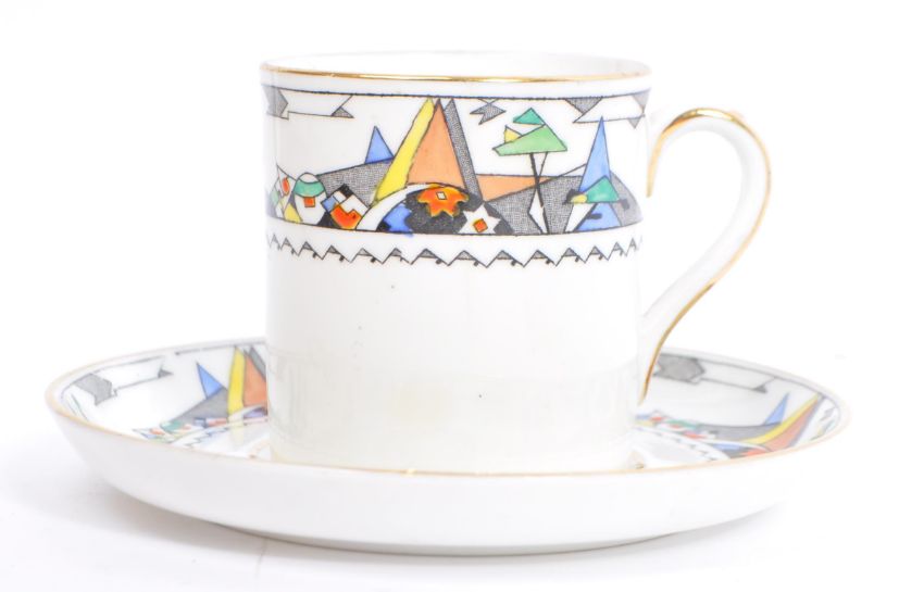 Foley - A 20th Century circa 1930s  Art Deco Foley china part coffee service having polychrome geometric patterned decoration with gilt bands. The set comprising coffee pot, cups / cans, saucers, jug and sugar bowl. Makers marks to the bases.